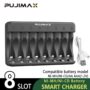 Carregador de Pilhas NI-MH e Ni-Cd AA e AAA (palito) Pujmax com indicador de carga com indicador LED. Possui entrada Type-C (acompanha cabo Type-C). Carrega até 8 pilhas em simultâneo (AA ou AAA)