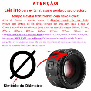 Atenção! Antes de efetuar a compra do filtro, certifique-se de que esta comprando o tamanho correto para sua lente. Para identificar o tamanho correto da rosca de sua lente, procure pelo simbolo de um círculo cortado por uma barra igual a esse: Ø . A medida da rosca vai estar bem na frente desse símbolo especificado em milímetros (mm), como nos exemplos a seguir: Ø49mm, Ø52mm, Ø55mm, Ø58mm, Ø62mm, Ø67mm, Ø72mm, Ø77mm, Ø82mm e assim por diante. Não confundir com a distância focal da lente, exemplo: 55mm, 18mm, 70mm etc… Caso tenha dificuldades favor entrar em contato para que possamos ajuda-lo. Veja as fotos com as instruções.